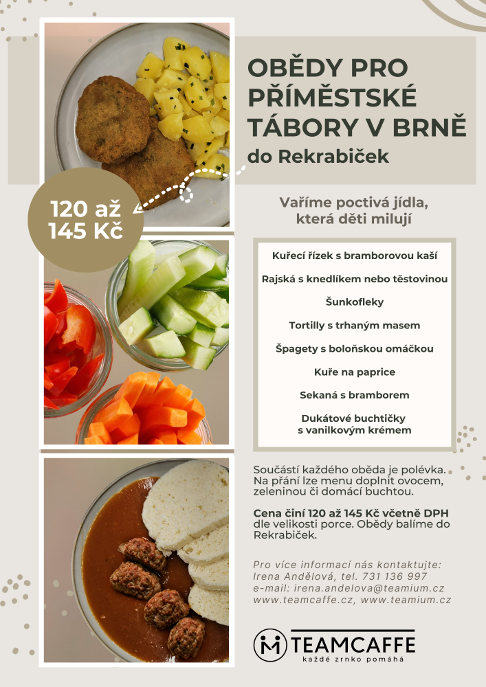 Plánujete příměstský tábor, letní kemp nebo skautskou akci a řešíte zajištění obědů a svačin pro děti? Rádi Vám nabídneme osvědčené řešení, které spojuje kvalitní jídlo, spolehlivou logistiku a smysluplný přesah. Pod značkou Teamcaffe zajišťujeme obědy a svačinky pro příměstské tábory již několik let a víme, co děti skutečně ocení – poctivá jídla, která jim chutnají, a zároveň splňují nároky organizátorů i rodičů.